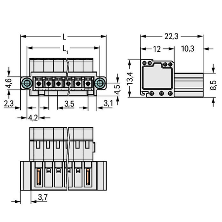 1-conductor male connector; 100% protected against mismating; Threaded flange; 1.5 mm²; Pin spacing 3.5 mm; 7-pole; 1,50 mm²; light gray Wago