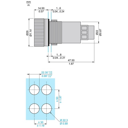 gama de produse: Harmony XB5 Tip produs sau componenta: Temporizator cantitate indivizibila de vanzare: 1 material rama: Plastic material inel de fixare: Plastic diametrul de montaj: 22 mm Panel Thickness: 1…6 mm forma a capului unitatii de semnalizare: Rotund intervalul de intarziere: 0.5...10 s tip intarziere: A precizie de repetare: +/- 0,5 % setarea preciziei temporizarii: +/- 10 % din capatul scarii la 25 °C conformitate cu IEC 61812-1 Abatere temperatura: +/- 0,05 %/°C abatere a tensiunii: +/- 0,2 %/V tip de protectie: Protectie la supratensiune Protectie fata de polaritate inversa grad de poluare: 3 conformitate cu SR EN 60664-1 tip de iesire: Open collector PNP curent temporar permis: 10 A pentru 0.01 s curentul minim comutat: 10 mA Voltage drop in closed state: 3 V Nominal rating: 200 mA at 20 °C( derating 1.5 mA per °C) Residual current in open state: 0,1 mA puterea maxima consumata in W: 1 W resetare timp: 5 ms after time delay la intreruperea alimentarii 7 ms during time delay la intreruperea alimentarii semnalizare locala: LED verde, intermitent pentru temporizare in progres LED, stabil pentru no timing in progress and output relay energised [Us] tensiune nominala de alimentare: 24 V c.c. limitele tensiunii de alimentare: 16,8…31,2 V c.c. protectie la scurtcircuit pentru iesire: Yes conexiuni - borne: Borne cu surub 1 x 4 mm² conformitate cu IEC 60947-1 Borne cu surub 1 x 2,5 mm² conformitate cu IEC 60947-1 grad de protectie IP: IP65 fata: conforming to SR EN 60529 IP20 spate: conforming to SR EN 60529 temperatura ambientala de functionare: -20…60 °C temperatura ambietala pentru depozitare: -20…80 °C cuplu de strangere: 0,5 N.m rigiditate dielectrica: 1500 V conformitate cu IEC 61812-1 [Ui] tensiune nominala de izolatie: 50 V conformitate cu IEC 60947-1 50 V conformitate cu SR EN 60664-1 [Uimp] tensiune de tinere la impuls: 4 kV conformitate cu IEC 60947-1 4 kV conformitate cu SR EN 60664-1 incercare la supratensiuni tranzitorii: 1 kV, nivelul 2 conformitate cu IEC 61000-4-5 categorie de supratensiune: Class 3 conforming to IEC 60536 Class 3 conforming to SR EN 60664-1 rezistenta la vibratii: 0.15 mm (f= 10…60 Hz) conforming to IEC 60068-2-6 2 gn (f= 60…150 Hz) conforming to IEC 60068-2-6 rezistenta la socuri: +/- 15 gn pentru 11 ms (6 şocuri pe fiecare axă) conformitate cu IEC 60068-2-27 rezistenta la tranzienti rapizi: 2 kV clasă nivel 3 conformitate cu IEC 61000-4-4 compatibilitate electromagnetica: Descărcare electrostatică 6 kV nivel 3 conformitate cu IEC 61000-4-2 Emisii electromagnetice clasa B conformitate cu IEC 55011 rezistenta la campuri electromagnetice: 10 V/m 80 MHz - 1 GHz nivel 3 conformitate cu IEC 61000-4-3 3 V/m 1.4...2 GHz nivelul 2 conformitate cu IEC 61000-4-3 1 V/m 2 - 2.7 GHz nivel 1 conformitate cu IEC 61000-4-3 imunitate la campuri radioelectrice: 10 V nivel 3 conformitate cu IEC 61000-4-6 perturbatie radiata/condusa: Clasa B conformitate cu EN 50022 standarde: IEC 61812-1 UL 60947-1 certificari produs: UE listat de UL prezentare dispozitiv: Monolithic product inaltime: 62 mm latime: 29 mm adancime: 29 mm greutate neta: 0,027 kg diametru: 29 mm