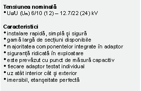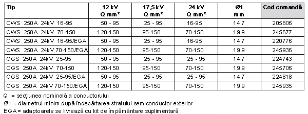 Tipul CWS/CGS 250A se conecteaza la celule/transformatoare de medie tensiune, cu borne de tip A (conf EN 50180, EN 50181 si DIN 47636) cu trecere etansa, prezentand solutie pentru tensiuni de lucru de pana la 24 kV