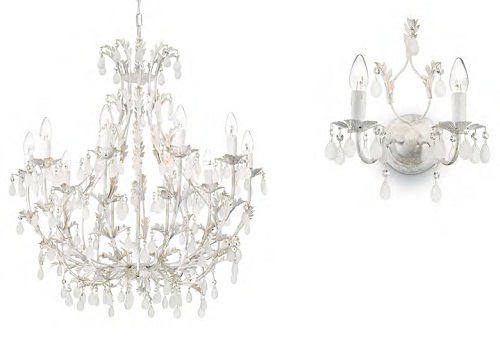 Aplica ce foloseste un cadru metalic decorat cu frunze lucrate si vopsite manual cu finisaj alb si auriu. Prezinta pandantive matuite cu ajutorul unui acid. Aplica este dotata cu 2 becuri (neincluse), dar se poate echipa optional cu becuri tip LED, halogen sau economice. Din gama Cascina mai fac parte candelabrele cu 10, 8 sau 5 becuri si veioza cu 1 bec, ce se regasesc in sectiunea de produse compatibile. Fiind un accesoriu de design clasic aduce un plus de rafinament incaperilor si le confera un aer nobil si grandios, indeplinindu-si in acelasi timp si rolul functional.