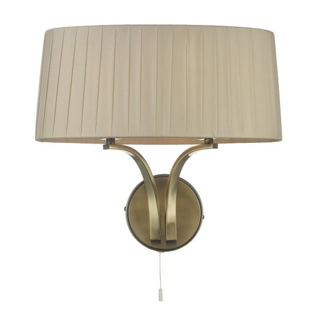 The traditional Cristin Wall Light with an antique brass frame complete with a taupe ribbon shade. The wall light is operated by a pull cord.Measurements D18 x H32 x W36cm