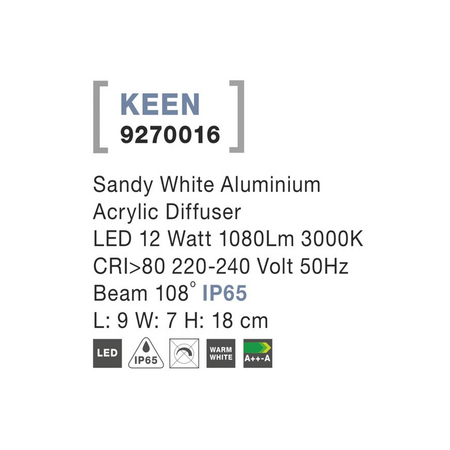 Aplica KEEN Nisipiu Alb Aluminiu Acrylic Diffuser LED 12 Wat 1080Lm 3000K, 220-240 Volt 50Hz Beam 108 degrees -IP65 Novaluce