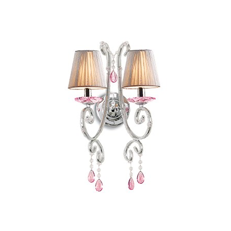 Aplica ce foloseste un cadru metalic cromat, decorat cu perle confectionate din sticla, cristale octogonale si pandantive in forma de picatura de apa. Abajurul este confectionat din folie de PVC cusut cu fire de argint. Aplica este dotata cu 2 becuri (neincluse), dar se poate echipa optional cu becuri tip LED, halogen sau economice. Din gama Violette mai fac parte: candelabrele cu 6 sau 3 becuri, si veioza de birou cu 1 bec, toate regasindu-se in sectiunea de produse compatibile. Fiind un accesoriu de design clasic aduce un plus de rafinament incaperilor si le confera un aer nobil si grandios, indeplinindu-si in acelasi timp si rolul functional.
