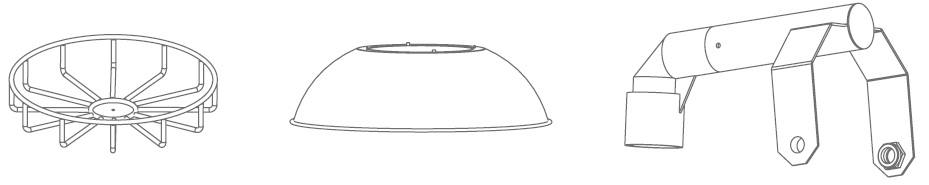 Grila de protectie (PLFS LED 10-130); reflector pentru distributia largă a fluxului luminos pentru exterior (PLFS LED 10-150); suport de fixare pentru tub de 2 ½ " (PLFS 20-120)