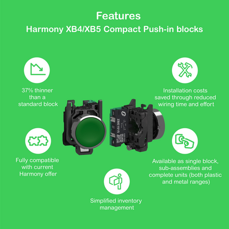 gama de produse: Harmony XB5 Harmony XB4 Tip produs sau componenta: Bloc de contacte nume scurt al dispozitivului: ZBE cantitate indivizibila de vanzare: 5 grad de protectie IP: IP20 conformitate cu SR EN 60529 operare contacte: Decuplare lenta tip bloc de contacte: Monofilar utilizare contacte: Contacte standard conexiuni - borne: Push-in, <= 2 x 1.5 mm² with wire end ferrule conformitate cu IEC 60947-1 Push-in, >= 1 x 0.34 mm² without wire end ferrule conformitate cu IEC 60947-1 CAD latime globala: 34,3 mm CAD inaltime globala: 14,8 mm CAD adancime globala: 9,8 mm greutate neta: 0,005 kg tip si compozitie contacte: 1 NO deschidere pozitiva: Fara cursa de operare: 2,05 mm (modificarea stării electrice NO) 4,3 mm (cursă totală) forta de actionare: 2,45 N modificarea stării electrice NO durabilitate mecanica: 10000000 cic Material contacte: Aliaj de argint (Ag/Ni) protectie la scurtcircuit: 10 A cartuş fuzibil tip gG conformitate cu SR EN 60947-5-1 [Ith] curent termic conventional in aer liber: 10 A conformitate cu SR EN 60947-5-1 [Ui] tensiune nominala de izolatie: 300 V (grad de poluare 3) conformitate cu IEC 60947-1 [Uimp] tensiune de tinere la impuls: 4 kV conformitate cu IEC 60947-1 [Ie] curent nominal de utilizare: 6 A la 120 V, AC-15, A300 conformitate cu SR EN 60947-5-1 3 A la 240 V, AC-15, A300 conformitate cu SR EN 60947-5-1 0,55 A la 125 V, DC-13, Q300 conformitate cu SR EN 60947-5-1 0,27 A la 250 V, DC-13, Q300 conformitate cu SR EN 60947-5-1 montarea cutiei de borne: Montajin fata prezentare dispozitiv: Element de baza tratament protector: TH temperatura ambietala pentru depozitare: -40…70 °C temperatura ambientala de functionare: -40…70 °C standarde: IEC 60947-1 SR EN 60947-5-1 SR EN 60947-5-4 IEC 60947-5-5 UL 61010-1 UL 60947-5-1 UL 60947-5-5 UL 1059 UL 486E CSA C22.2 No 60947-1 CSA C22.2 No 60947-5-1 CSA C22.2 No 158 CSA C22.2 No 65 IACS E10 certificari produs: EAC IECEE CB Scheme CCC UL CSA rezistenta la vibratii: 5 gn (f= 10…500 Hz) conforming to IEC 60068-2-6 25 mm peak to peak (f= 2…10 Hz) conforming to IEC 60068-2-6 rezistenta la socuri: 25 gn (durata = 6 ms) pentru 1000 shocks on each axis conformitate cu IEC 60068-2-27 30 gn (durata = 18 ms) pentru half sine wave acceleration conformitate cu IEC 60068-2-27 50 gn (durata = 11 ms) pentru half sine wave acceleration conformitate cu IEC 60068-2-27