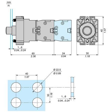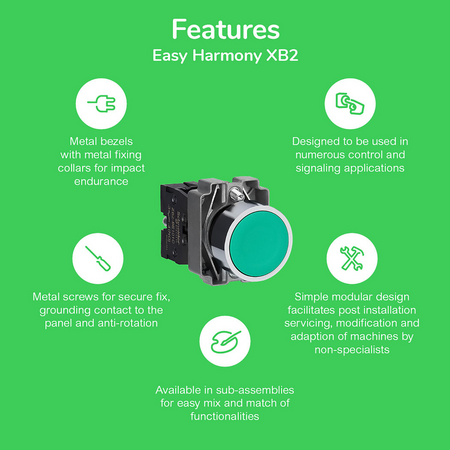 gama de produse: Easy Harmony XB2 Tip produs sau componenta: Ansamblu corp complet/contact si bloc de lumini nume componenta: ZB2 tip corp: Corp pentru butonul de comanda iluminat cantitate indivizibila de vanzare: 1 prezentare dispozitiv: Element de baza nume scurt al dispozitivului: XB2 operare contacte: Decuplare lenta diametrul de montaj: 22,5 mm [Us] tensiune nominala de alimentare: 230...240 V tip si compozitie contacte: 1 NO conexiuni - borne: Borne cu surub material rama: Metal cromat descriere borne ISO nr. 1: (13-14)NO curent nominal [Ie] : 3 A 240 V AC-15 operare contacte auxiliare: Standard baza bec: BA 9s tip bec: LED curent continuu nominal [Ie] : DC-13 0,27 A la 250 V Contacte auxiliare NC: 0 Contacte auxiliare NO: 1 tip circuit de alimentare: C.a. frecventa de alimentare: 50 Hz 60 Hz inaltime: 30 mm latime: 40 mm adancime: 67 mm greutate neta: 0,090 kg conexiuni - borne: Borna cu clema cu surub, <= 2 x 1.5 mm² with and without cable ends Borna cu clema cu surub, <= 1 x 2.5 mm² with and without cable ends Borna cu clema cu surub, >= 1 x 0.5 mm² with and without cable ends Borne Faston, dimensiune conexiune6.3 mm mod de fixare: Fixing screw beneath head cuplu recomandat: 0,8 N.m Fixing screw beneath head cuplu recomandat: 1,0 N.m cuplu de strangere: 0,8…1,0 N.m [Uimp] tensiune de tinere la impuls: 6 kV conformitate cu IEC 60947-1 [Ui] tensiune nominala de izolatie: 600 V (grad de poluare 3) conformitate cu IEC 60947-1 Material contacte: Aliaj de argint (Ag/Ni) utilizare contacte: Contacte standard material inel de fixare: Zamak durabilitate mecanica: 3000000 cic conexiune electrica: Terminal cu clema si surub captiv culoare bloc de lumini: Albastru alimentare bloc de lumini: Utilizand transformator integral sursa de lumina: LED securitatea electrica IEC 60947-5-4: Λ < 10exp(-6) la 5 V, 1 mA in mediu curat conformitate cu SR EN 60947-5-4 Λ < 10exp(-8) la 17 V, 5 mA in mediu curat conformitate cu SR EN 60947-5-4 [Ie] curent nominal de utilizare: 3 A la 240 V, AC-15, A600 conformitate cu SR EN 60947-5-1 0,27 A la 250 V, DC-13, Q600 conformitate cu SR EN 60947-5-1 protectie la scurtcircuit: 10 A gL fuse tip gG conformitate cu SR EN 60947-5-1 [Ith] curent termic conventional in aer liber: 10 A conformitate cu SR EN 60947-5-1 deschidere pozitiva: Fara forma a capului surubului: Cruce compatibil cu Philips nr. 1 surubelnita Cruce compatibil cu pozidriv No 1 surubelnita Perforat compatibil cu plat O 4 mm surubelnita Perforat compatibil cu plat O 5.5 mm surubelnita cursa de operare: 2,88 mm (modificarea stării electrice NO) 5,0 mm (cursă totală) durabilitate electrica: 1000000 cic, AC-15, 3 A la 240 V, rata de functionare 1000000 cic, DC-13, 0,27 A la 250 V, rata de functionare tratament protector: TC/TH tip semnalizare: Stabil consum de curent: < 20 mA durata de utilizare: 5000 H la tensiunea nominală şi 25 °C limitele tensiunii de alimentare: 176…242 V c.a. [Us] tensiune nominala de alimentare: 230...240 V c.a. 50/60 Hz personalizabil: Nu rezistenta la vibratii: 5 gn (f= 2…500 Hz) conforming to IEC 60068-2-6 standarde: SR EN 60947-5-1 SR EN 60947-5-4 IEC 60947-1 GB/T 14048.1 GB/T 14048.5 rezistenta la socuri: 30 gn (durata = 18 ms) pentru half sine wave acceleration conformitate cu IEC 60068-2-27 50 gn (durata = 11 ms) pentru half sine wave acceleration conformitate cu IEC 60068-2-27 certificari produs: UE CCC Compatibilitate produs: ZB2..C grad de protectie IK: IK06 grad de protectie IP: IP65 temperatura ambientala de functionare: -25…70 °C temperatura ambietala pentru depozitare: -40…70 °C rezistenta la tranzienti rapizi: 2 kV conformitate cu IEC 61000-4-4 rezistenta la descarcari electrostatice: 4 kV pe contact (pe părţile metalice) conformitate cu IEC 61000-4-2 8 kV in aer liber (in părţile izolate) conformitate cu IEC 61000-4-2 rezistenta la campuri electromagnetice: 10 V/m conformitate cu IEC 61000-4-3 incercare la supratensiuni tranzitorii: 1 kV line to line conformitate cu IEC 61000-4-5 2 kV line to earth conformitate cu IEC 61000-4-5 categorie de supratensiune: Class I conforming to IEC 60536