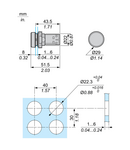 gama de produse: Harmony XB7 Tip produs sau componenta: Intrerupator cu revenire nume scurt al dispozitivului: XB7 diametrul de montaj: 22 mm cantitate indivizibila de vanzare: 10 grad de protectie IP: IP20 conformitate cu SR EN 60529 (cu spatele in faţă) IP65 conformitate cu SR EN 60529 (fata frontala) forma a capului unitatii de semnalizare: Rotund tip de operator: push and push-to-release profil utilizator: Verde Incastrat tip si compozitie contacte: 1 NO conexiuni - borne: Borne cu surub, <= 2 x 1.5 mm² cu pini conformitate cu IEC 60947-1 Borne cu surub, 1 x 0.34...2 x 2.5 mm² fara terminale de cablu conformitate cu IEC 60947-1 prezentare dispozitiv: Monolithic product CAD latime globala: 29 mm CAD inaltime globala: 29 mm CAD adancime globala: 51,5 mm descriere borne ISO nr. 1: (21-22)NC (13-14)NO greutate neta: 0,021 kg montare dispozitiv: Gaură de fixare - diametru: 22,5 mm 22.3 +0.4/0 conformitate cu IEC 60947-1 centru de fixare: >= 30 x 40 mm (suport panou) metal - grosime: 1…6 mm >= 30 x 40 mm (suport panou) plastic - grosime: 2…6 mm mod de fixare: Piuliţă de fixare sub cap 2…2,4 N.m marcaj: Nemarcat operare contacte: Decuplare lenta deschidere pozitiva: Cu contact NC conformitate cu IEC 60947-5-1 anexa K durabilitate mecanica: 300000 cic cuplu de strangere: 0,8…1,2 N.m conformitate cu IEC 60947-1 forma a capului surubului: Cruce compatibil cu JIS No 1 surubelnita Cruce compatibil cu Philips nr. 1 surubelnita Cruce compatibil cu pozidriv No 1 surubelnita Perforat compatibil cu plat O 4 mm surubelnita Perforat compatibil cu plat O 5.5 mm surubelnita protectie la scurtcircuit: 4 A cartuş fuzibil tip gG conformitate cu SR EN 60947-5-1 [Ui] tensiune nominala de izolatie: 250 V (grad de poluare 3) conformitate cu IEC 60947-1 [Uimp] tensiune de tinere la impuls: 4 kV conformitate cu IEC 60947-1 [Ie] curent nominal de utilizare: 0,1 A la 250 V, DC-13, R300 conformitate cu SR EN 60947-5-1 0,22 A la 125 V, DC-13, R300 conformitate cu SR EN 60947-5-1 0,3 A la 240 V, AC-14, D300 conformitate cu SR EN 60947-5-1 0,6 A la 120 V, AC-14, D300 conformitate cu SR EN 60947-5-1 durabilitate electrica: 1000000 cic, DC-13, 0,3 A la 24 V, rata de functionare 1000000 cic, AC-15, 0,03 A la 230 V, rata de functionare 1000000 cic, AC-15, 0,09 A la 240 V, rata de functionare securitatea electrica IEC 60947-5-4: Λ <= 10exp(-6) la 17 V, 5 mA conformitate cu SR EN 60947-5-4 tratament protector: TH temperatura ambietala pentru depozitare: -40…70 °C temperatura ambientala de functionare: -25…70 °C categorie de supratensiune: Clasa II conforming to IEC 61140 Enclosure Type: Type 12 Type 3 standarde: UL 60947-1 SR EN 60947-5-1 CSA C22.2 No 15 JIS C8201-5-1 IEC 60947-1 JIS C8201-1 certificari produs: CCC GOST rezistenta la vibratii: 5 gn (f= 2…500 Hz) conforming to IEC 60068-2-6 rezistenta la socuri: 50 gn (durata = 11 ms) pentru half sine wave acceleration conformitate cu IEC 60068-2-27 30 gn (durata = 18 ms) pentru half sine wave acceleration conformitate cu IEC 60068-2-27