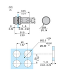 gama de produse: Harmony XB7 Tip produs sau componenta: Illuminated push-button nume scurt al dispozitivului: XB7 diametrul de montaj: 22 mm cantitate indivizibila de vanzare: 10 grad de protectie IP: IP20 conformitate cu SR EN 60529 (cu spatele in faţă) IP65 conformitate cu SR EN 60529 (fata frontala) forma a capului unitatii de semnalizare: Rotund tip de operator: revenire cu arc profil utilizator: Verde proiectare, nemarcat tip si compozitie contacte: 1 NO conexiuni - borne: Borne cu surub, <= 2 x 1.5 mm² cu pini conformitate cu IEC 60947-1 Borne cu surub, 1 x 0.34...2 x 2.5 mm² fara terminale de cablu conformitate cu IEC 60947-1 sursa de lumina: LED baza bec: LED integral [Us] tensiune de alimentare nominala: 24 V c.a./c.c. prezentare dispozitiv: Monolithic product CAD latime globala: 29 mm CAD inaltime globala: 29 mm CAD adancime globala: 57,5 mm descriere borne ISO nr. 1: (13-14)NO greutate neta: 0,023 kg montare dispozitiv: Gaură de fixare - diametru: 22,5 mm 22.3 +0.4/0 conformitate cu IEC 60947-1 centru de fixare: >= 30 x 40 mm (suport panou) metal - grosime: 1…6 mm >= 30 x 40 mm (suport panou) plastic - grosime: 2…6 mm mod de fixare: Piuliţă de fixare sub cap 2…2,4 N.m operare contacte: Decuplare lenta deschidere pozitiva: Cu (doar ND) durabilitate mecanica: 300000 cic cuplu de strangere: 0,8…1,2 N.m conformitate cu IEC 60947-1 forma a capului surubului: Cruce compatibil cu JIS No 1 surubelnita Cruce compatibil cu Philips nr. 1 surubelnita Cruce compatibil cu pozidriv No 1 surubelnita Perforat compatibil cu plat O 4 mm surubelnita Perforat compatibil cu plat O 5.5 mm surubelnita protectie la scurtcircuit: 4 A cartuş fuzibil tip gG conformitate cu SR EN 60947-5-1 [Ui] tensiune nominala de izolatie: 250 V (grad de poluare 3) conformitate cu IEC 60947-1 [Uimp] tensiune de tinere la impuls: 4 kV conformitate cu IEC 60947-1 [Ie] curent nominal de utilizare: 0,1 A la 250 V, DC-13, R300 conformitate cu SR EN 60947-5-1 0,22 A la 125 V, DC-13, R300 conformitate cu SR EN 60947-5-1 0,3 A la 240 V, AC-14, D300 conformitate cu SR EN 60947-5-1 0,6 A la 120 V, AC-14, D300 conformitate cu SR EN 60947-5-1 durabilitate electrica: 1000000 cic, DC-13, 0,3 A la 24 V, rata de functionare 1000000 cic, AC-15, 0,03 A la 230 V, rata de functionare 1000000 cic, AC-15, 0,09 A la 240 V, rata de functionare securitatea electrica IEC 60947-5-4: Λ <= 10exp(-6) la 17 V si 5 mA conformitate cu SR EN 60947-5-4 tip semnalizare: Stabil limitele tensiunii de alimentare: 19,2…30 V c.c. 21,6…26,4 V c.a. consum de curent: 18...27 mA durata de utilizare: 70000 H la tensiunea nominală şi 25 °C tratament protector: TH temperatura ambietala pentru depozitare: -40…70 °C temperatura ambientala de functionare: -25…70 °C clasa de protectie la electrocutare: Clasa II conforming to IEC 61140 Enclosure Type: Type 12 standarde: JIS C8201-5-1 SR EN 60947-5-1 IEC 60947-1 UL 60947-1 CSA C22.2 No 15 JIS C8201-1 certificari produs: CCC GOST rezistenta la vibratii: 5 gn (f= 2…500 Hz) conforming to IEC 60068-2-6 rezistenta la socuri: 50 gn (durata = 11 ms) pentru half sine wave acceleration conformitate cu IEC 60068-2-27 30 gn (durata = 18 ms) pentru half sine wave acceleration emisie electromagnetica: Clasa B conformitate cu IEC 55011