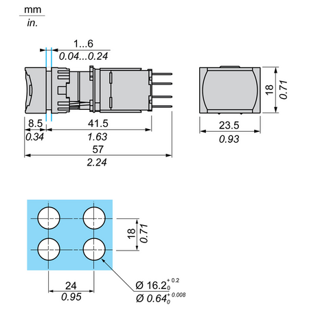 gama de produse: Harmony XB6 Tip produs sau componenta: Buton iluminat complet nume scurt al dispozitivului: XB6 material rama: Plastic diametrul de montaj: 16 mm cantitate indivizibila de vanzare: 1 forma a capului unitatii de semnalizare: Dreptunghiular tip de operator: zăvorare profil utilizator: Verde Incastrat, nemarcat tip si compozitie contacte: 1 NO operare contacte: Decuplare lenta conexiuni - borne: Conectori Faston, dimensiune conexiune2.8 x 0.5 mm sursa de lumina: LED baza bec: LED integral [Us] tensiune de alimentare nominala: 12...24 V c.a./c.c. inaltime: 18 mm latime: 24 mm adancime: 57 mm descriere borne ISO nr. 1: (13-14)NO greutate neta: 0,022 kg pozitie de operare: Orice pozitie deschidere pozitiva: Cu conformitate cu EN/IEC 60947-5-1 anexa K cursa de operare: 1 mm (modificarea stării electrice NO) 3,5 mm (cursă totală) forta de actionare: 3,5 N modificarea stării electrice NO Material contacte: Aliaj de argint (Ag/Ni) protectie la scurtcircuit: 6 A cartuş fuzibil tip gG [Ui] tensiune nominala de izolatie: 250 V (grad de poluare 3) conformitate cu EN/IEC 60947-1 [Uimp] tensiune de tinere la impuls: 4 kV conformitate cu EN/IEC 60947-1 [Ie] curent nominal de utilizare: 3 A la 120 V, AC-15, B300 conformitate cu SR EN 60947-5-1 1,5 A la 240 V, AC-15, B300 conformitate cu SR EN 60947-5-1 0,1 A la 250 V, DC-13, R300 conformitate cu SR EN 60947-5-1 0,22 A la 125 V, DC-13, R300 conformitate cu SR EN 60947-5-1 durabilitate electrica: 1000000 cic, AC-15 la 230 V, rata de functionare 1000000 cic, DC-13 la 230 V, rata de functionare securitatea electrica IEC 60947-5-4: Λ = 10exp(-8) la 5 V si 1 mA cu nivel de incredere 90 % conformitate cu SR EN 60947-5-4 tip semnalizare: Stabil limitele tensiunii de alimentare: 6…30 V c.a./c.c. consum de curent: 15 mA incercare la supratensiuni tranzitorii: 1 kV contact direct conformitate cu IEC 61000-4-5 2 kV in aer liber conformitate cu IEC 61000-4-5 tratament protector: TC temperatura ambietala pentru depozitare: -40…70 °C temperatura ambientala de functionare: -25…70 °C clasa de protectie la electrocutare: Clasa II conforming to IEC 61140 grad de protectie IP: IP65 conformitate cu SR EN 60529 grad de protectie NEMA: NEMA 13 conformitate cu UL 50 NEMA 4 conformitate cu UL 50 NEMA 4X conformitate cu UL 50 NEMA 13 conformitate cu CSA C22.2 No 94 NEMA 4 conformitate cu CSA C22.2 No 94 NEMA 4X conformitate cu CSA C22.2 No 94 standarde: CSA C22.2 No 15 JIS C 4520 UL 60947-1 SR EN 60947-5-1 EN/IEC 60947-5-5 EN/IEC 60947-1 JIS C 852 certificari produs: CSA GOST UL CCC rezistenta la vibratii: +/- 3 mm (f= 2…500 Hz) conforming to IEC 60068-2-6 5 gn (f= 2…500 Hz) conforming to IEC 60068-2-6 rezistenta la socuri: 30 gn (durata = 18 ms) pentru half sine wave acceleration conformitate cu IEC 60068-2-27 50 gn (durata = 11 ms) pentru half sine wave acceleration conformitate cu IEC 60068-2-27 rezistenta la tranzienti rapizi: 2 kV conformitate cu IEC 61000-4-4 rezistenta la campuri electromagnetice: 10 V/m conformitate cu IEC 61000-4-3 rezistenta la descarcari electrostatice: 6 kV pe contact (pe părţile metalice) conformitate cu IEC 61000-4-2 8 kV in aer liber (in părţile izolate) conformitate cu IEC 61000-4-2 emisie electromagnetica: Clasa B conformitate cu IEC 55011