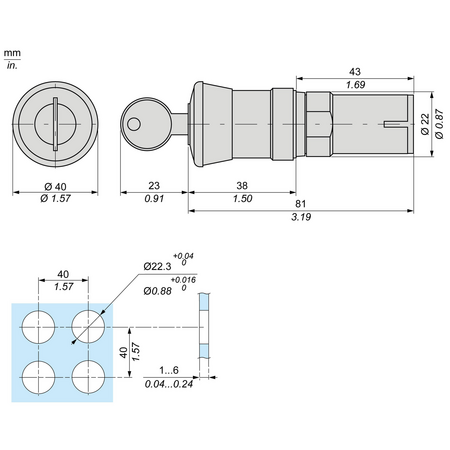 gama de produse: Harmony XB7 Tip produs sau componenta: Emergency stop push-button nume scurt al dispozitivului: XB7 diametrul de montaj: 22 mm cantitate indivizibila de vanzare: 10 forma a capului unitatii de semnalizare: Rotund tip de operator: zăvorare resetare: Declansator cu cheie profil utilizator: Rosu ciupercă O 40 mm, nemarcat tip de blocaj: Cheie 455 tip si compozitie contacte: 1 NO + 1 NC conexiuni - borne: Borne cu surub, <= 2 x 1.5 mm² cu pini conformitate cu IEC 60947-1 Borne cu surub, 1 x 0.34...2 x 2.5 mm² fara terminale de cablu conformitate cu IEC 60947-1 prezentare dispozitiv: Monolithic product CAD latime globala: 40 mm CAD inaltime globala: 40 mm CAD adancime globala: 72 mm descriere borne ISO nr. 1: (21-22)NC (13-14)NO greutate neta: 0,035 kg montare dispozitiv: Gaură de fixare - diametru: 22,5 mm 22.3 +0.4/0 conformitate cu IEC 60947-1 centru de fixare: >= 30 x 40 mm (suport panou) metal - grosime: 1…6 mm >= 30 x 40 mm (suport panou) plastic - grosime: 2…6 mm mod de fixare: Piuliţă de fixare sub cap 2…2,4 N.m operare contacte: Salt al curentului de iesire utilizare contacte: Standard deschidere pozitiva: Cu conformitate cu IEC 60947-5-1 anexa K durabilitate mecanica: 100000 cic cuplu de strangere: 0,8…1,2 N.m conformitate cu IEC 60947-1 forma a capului surubului: Cruce compatibil cu JIS No 1 surubelnita Cruce compatibil cu Philips nr. 1 surubelnita Cruce compatibil cu pozidriv No 1 surubelnita Perforat compatibil cu plat O 4 mm surubelnita Perforat compatibil cu plat O 5.5 mm surubelnita protectie la scurtcircuit: 4 A cartuş fuzibil tip gG conformitate cu SR EN 60947-5-1 [Ui] tensiune nominala de izolatie: 250 V (grad de poluare 3) conformitate cu IEC 60947-1 [Uimp] tensiune de tinere la impuls: 4 kV conformitate cu IEC 60947-1 [Ie] curent nominal de utilizare: 0,1 A la 250 V, DC-13, R300 conformitate cu SR EN 60947-5-1 0,22 A la 125 V, DC-13, R300 conformitate cu SR EN 60947-5-1 0,75 A la 240 V, AC-15, C300 conformitate cu SR EN 60947-5-1 1,5 A la 120 V, AC-15, C300 conformitate cu SR EN 60947-5-1 durabilitate electrica: 1000000 cic, DC-13, 0,3 A la 24 V, rata de functionare 1000000 cic, AC-15, 0,03 A la 230 V, rata de functionare 1000000 cic, AC-15, 0,09 A la 240 V, rata de functionare securitatea electrica IEC 60947-5-4: Λ < 5 x 10exp(-7) la 17 V si 5 mA conformitate cu SR EN 60947-5-4 tratament protector: TH temperatura ambietala pentru depozitare: -40…70 °C temperatura ambientala de functionare: -25…70 °C clasa de protectie la electrocutare: Clasa II conforming to IEC 60536 grad de protectie IP: IP20 conformitate cu SR EN 60529 (cu spatele in faţă) IP65 conformitate cu SR EN 60529 (fata frontala) Enclosure Type: Type 12 Type 3 standarde: IEC 60947-5-5 IEC 60364-5-53 ISO 13850 IEC 60947-1 SR EN 60947-5-1 CSA C22.2 No 15 UL 60947-1 IEC 60204-1 certificari produs: CCC GOST rezistenta la vibratii: 5 gn (f= 2…500 Hz) conforming to IEC 60068-2-6 rezistenta la socuri: 15 gn (durata = 11 ms) pentru half sine wave acceleration conformitate cu IEC 60068-2-27