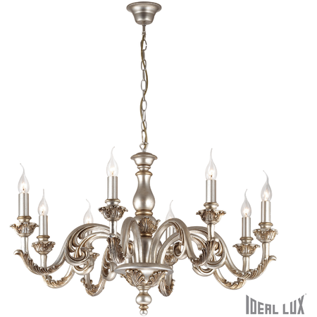 Corp de iluminat suspendat ce foloseste un cadru metalic imbracat in rasina si modelat manual prin tehnici artizanale ce imita lemnul sculptat. Efectul antic este obtinut prin vopsirea manuala a frunzelor in auriu, argintiu sau alb. Lantul de sustinere este reglabil in lungime. Candelabrul este dotat cu 8 becuri (neincluse), dar se poate echipa optional cu becuri tip LED, halogen sau economice. Din gama Giglio mai fac parte candelabrele cu 8 sau 6 becuri si aplicile cu 2 becuri, toate disponibile in varianta argintie, alba, sau aurie, ce se regasesc in sectiunea de produse compatibile. Fiind un accesoriu de design clasic aduce un plus de rafinament incaperilor si le confera un aer nobil si grandios, indeplinindu-si in acelasi timp si rolul functional.