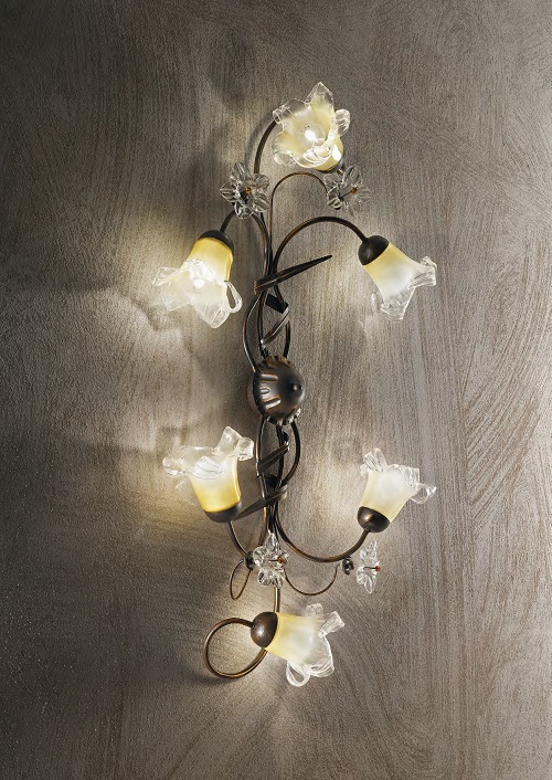Corp de iluminat suspendat ce foloseste un cadru complet metalic, modelat, decorat si vopsit manual ruginiu. Abajurul este confectionat din sticla transparenta colorata cu nuante de galben. Detaliile florale sunt lucrate manual cu ajutorul unor clesti. Lantul de sustinere este reglabil in lungime. Candelabrul este dotat cu 6 becuri (neincluse), dar se poate echipa optional cu becuri tip LED, halogen sau economice. Din gama Tirol mai fac parte si plafonierele cu 6 sau 3 becuri, aplica cu 2 becuri si veioza cu 1 bec ce se regasesc in sectiunea de produse compatibile. Fiind un accesoriu de design clasic aduce un plus de rafinament incaperilor si le confera un aer nobil si grandios, indeplinindu-si in acelasi timp si rolul functional.
