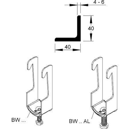 Clema in U, pentru corniere 40x40x4-6 mm, pentru 1 cablu, O 38-42 mm, otel, zincat la cald DIN EN ISO 1461, cu jgheab de presiune din otel Colier in U, pentru coltar, cu jgheab de presiune si surub pivot M 6 cu antrenare multipla, poate fi utilizat pe otel isoscel si isosceleron.
