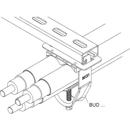 Clema in U cu trei fascicule, pentru 3 cabluri, O 36-44 mm, latime fanta 18-22 mm, otel, zincat la cald DIN EN ISO 1461 Cleme cu trei fascicule, inclusiv tava de presiune si dubla contra-tava cu protectie UV si surub M 8 acoperit cu zinc-nichel, pentru instalarea corecta a cablurilor cu un singur conductor in fascicul.