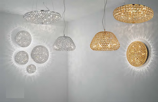 Corp de iluminat suspendat cu abajurul alcatuit din inele metalice decorate cu cristale octogonale incorporate in partea interioara. Cadrul metalic cat si abajurul sunt disponibile in finisaj cromat sau auriu. Cablurile de otel se pot regla in inaltime cu ajutorul unui dispozitiv automat.