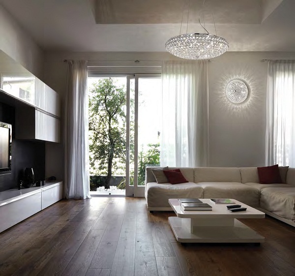 Corp de iluminat suspendat cu abajurul alcatuit din inele metalice decorate cu cristale octogonale incorporate in partea interioara. Cadrul metalic cat si abajurul sunt disponibile in finisaj cromat sau auriu. Cablurile de otel se pot regla in inaltime cu ajutorul unui dispozitiv automat.