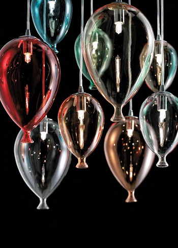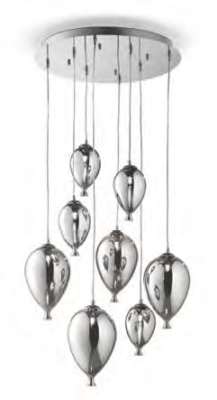 Corp de iluminat inedit din sticla suflata si prelucrata manual sub forma de balon de diferite dimensiuni. Balonul de sticla este disponibil in variantele multicolore cat si uni: alb sau cromat. Cadrul metalic fiind disponibil deasemnea in varianta cromata sau alba, reglabil pe inaltime