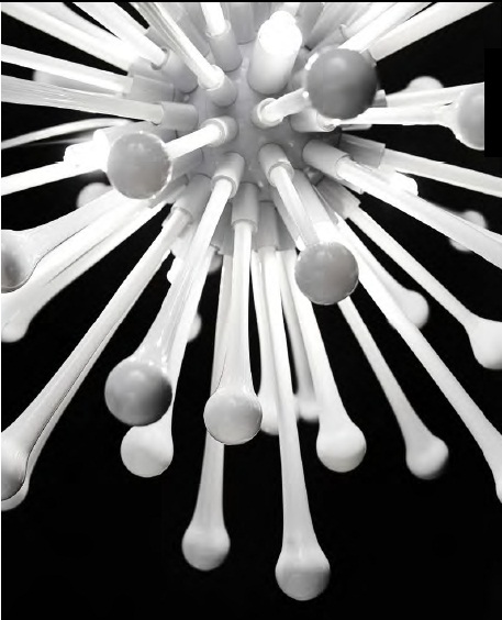 Corp de iluminat suspendat din sticla suflata si profilata manual cu elemente decorative albe sau cromate de diferite dimensiuni. Folosind un cadru metalic cromat impreuna cu elementele din sticla cromata, se potriveste cu usurinta in orice mediu tip de mediu este folosit dand dovada de extravaganta.