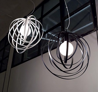 Corp de iluminat suspendat cu un design modern destinat spatiilor interioare, cu elemente decorative rotunde fabricate din metal de culoare alba ce se pot rotii si pozitiona independent pentru un look personalizat. Poate fi folosit in combinatie cu un bec ce permite reglarea intensitatii luminoase. Produs disponibil in culorile alb si negru.