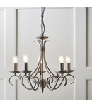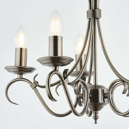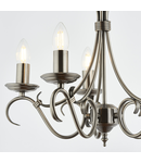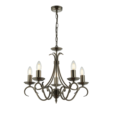 A 5 light ceiling fitting with scrolled arms in antique silver effect finish. suitable for use with LED lamps, height adjustable and dimmable. Matching items available and also comes in an antique brass finish