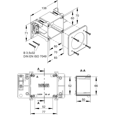 Cutie incorporabila pentru dispozitive industriale, inaltime 52 mm, plastic PA 6, RAL 7035, gri deschis Cutie incorporata pentru dispozitive industriale, inchidere frontala, design robust, cu spatiu mare de cablare, cu deschideri laterale de intrare a cablurilor pre-timbrate si decuplare, pentru agatare in capacul de receptie conturul canalului aparatului si pentru fixarea cu cleme pe profilele DINse5 ha dimensiuni corespunzatoare TSIN 3 60715, cu sina de prindere 60/70 mm, pentru receptia stecherelor si prizelor industriale de pana la 32A si pentru prizele CEE pana la 32A, fara halogeni, inclusiv set de accesorii. Sectiunea transversala aprox. 3167 mm² trebuie sa fie scazute din sectiunea transversala utilizabila a canalului dispozitivului. Certificat VDE! Setul este format din: 1 cutie incorporata dispozitiv GDI 60/70 cu detensionare 6 suruburi cu cap cilindric cu degajare transversala B 3,5x25 V conform. conform DIN EN ISO 7049 2 suruburi cu cap cilindru cu degajare transversala B 3,5x32 V conform. conform DIN EN ISO 7049 1 cadru de acoperire, nu sunt necesare placi perforate suplimentare. pentru piese inferioare ale trunchiului dispozitivului : GKU ..., DKU ..., PGU ..., PLU ..., GAU ..., DAU ..., ESDB 133/..., ESED 133/..., ESDD 133/... Dimensiuni (dimensiuni aprox.) H x L x A exterior : 71 x 138 x 52 mm dimensiuni interioare clare corp cutie H1 x B1 x T1 : 66 x 77 x 50 mm dimensiuni interioare utilizabile corpul cutiei minus cupolele cu surub H2 x B2 x T2 : 52 x 52 x 50 mm pentru deschiderea capacului: 78 mm Test de fir incandescent conform VDE 0471/DIN IEC 695 : 650°C Clasa de protectie: IP30 Culoare: gri deschis RAL: 7035 (similar) Material corp si cadru de acoperire: PA (poliamida), ignifug, auto-stingabil Material suruburi si cleme: otel, zincat