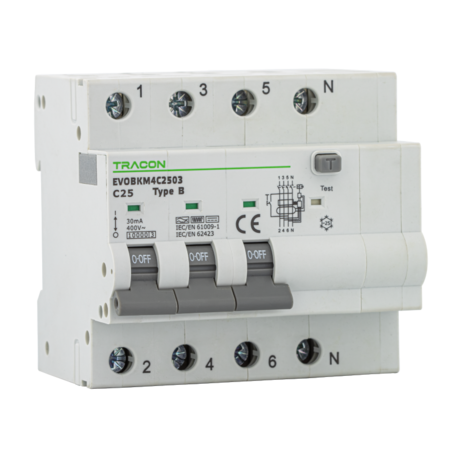 Disjunctor cu protectie diferentiala, 4P, 5 mod., curba B B20A, 30 mA, 6kA, B Tracon