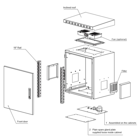 Organizare cabluri: Include flansa de intrare a cablurilor cu presetupe de tip 2xPG21 si 1xPG48 montate in podea.