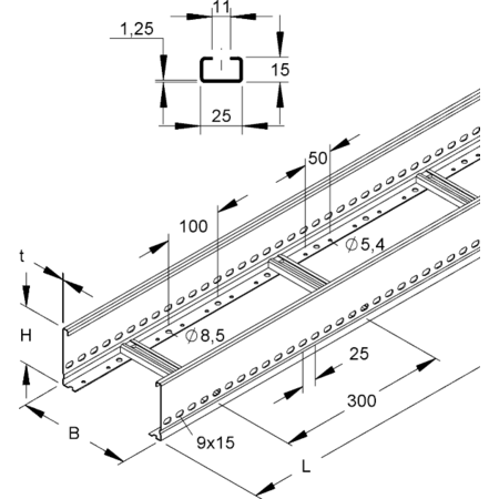 Scara de cablu, 100x600x3000 mm, t=1,5 mm, perforata, otel, prezincata conform DIN EN 10346 Scara de cablu conform. conform DIN EN 61537, cu sine laterale perforate si profilate continuu, cu trepte nituite din profile C cu latimea fantei de 11 mm.