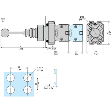 gama de produse: Easy Harmony XB2 Tip produs sau componenta: Controler cu maneta de comanda complet nume scurt al dispozitivului: XD2 diametrul de montaj: 22,5 mm material rama: Metal cromat cantitate indivizibila de vanzare: 1 prezentare dispozitiv: Produs complet [Ui] tensiune nominala de izolatie: 600 V (grad de poluare 3) conformitate cu IEC 60947-1 [Uimp] tensiune de tinere la impuls: 6 kV conformitate cu IEC 60947-1 informatii de pozitie operator: Toate pozitiile informatii directie operator: 2 directii tip si compozitie contacte: 2 NO pentru decuplare lenta utilizare contacte: Contacte standard protectie la scurtcircuit: 10 A gG (gl) gL fuse conformitate cu SR EN 60947-5-1 conexiuni - borne: Borna cu clema cu surub, <= 2 x 1.5 mm² with and without cable ends Borna cu clema cu surub, <= 1 x 2.5 mm² with and without cable ends Borna cu clema cu surub, >= 1 x 0.5 mm² with and without cable ends Borne Faston, dimensiune conexiune6.3 mm forma a capului surubului: Cruce compatibil cu Philips nr. 1 surubelnita Cruce compatibil cu pozidriv No 1 surubelnita Perforat compatibil cu plat O 4 mm surubelnita Perforat compatibil cu plat O 5.5 mm surubelnita durabilitate electrica: 1000000 cic, AC-15, 3 A la 240 V, rata de functionare 1000000 cic, DC-13, 0,27 A la 250 V, rata de functionare securitatea electrica IEC 60947-5-4: Λ < 10exp(-6) la 5 V si 1 mA in mediu curat conformitate cu SR EN 60947-5-4 Λ < 10exp(-8) la 17 V si 5 mA in mediu curat conformitate cu SR EN 60947-5-4 destinatie cod contact: A600-Q600 categorie de supratensiune: Class I conforming to IEC 60536 durabilitate mecanica: 1000000 cic centru de fixare: 30 x 85 mm revenire: cu arc inaltime: 30 mm latime: 40 mm adancime: 123,5 mm greutate neta: 0,115 kg [Ie] curent nominal de utilizare: 3 A la 240 V, AC-15, A600 conformitate cu SR EN 60947-5-1 0,27 A la 250 V, DC-13, Q600 conformitate cu SR EN 60947-5-1 tip si compozitie contacte: 2 NO Material contacte: Aliaj de argint (Ag/Ni) operare contacte: Decuplare lenta material inel de fixare: Zamak forma a capului unitatii de semnalizare: Rotund descriere borne ISO nr. 1: (13-14)NO (23-24)NO mod de fixare: Fixing screw beneath head cuplu recomandat: 0,8 N.m Fixing screw beneath head cuplu recomandat: 1,0 N.m cuplu de strangere: 0,8…1,0 N.m montare dispozitiv: Gaură de fixare - diametru: 22,5 mm [Ith] curent termic conventional in aer liber: 10 A conformitate cu SR EN 60947-5-1 personalizabil: Nu tip de operator: Revenire cu arc standarde: GB/T 14048.5 SR EN 60947-5-1 SR EN 60947-5-4 GB/T 14048.1 IEC 60947-1 certificari produs: CCC UE tratament protector: TC/TH temperatura ambietala pentru depozitare: -40…70 °C temperatura ambientala de functionare: -25…70 °C rezistenta la vibratii: 5 gn (f= 2…500 Hz) conforming to IEC 60068-2-6 rezistenta la socuri: 30 gn (durata = 18 ms) pentru half sine wave acceleration conformitate cu IEC 60068-2-27 50 gn (durata = 11 ms) pentru half sine wave acceleration conformitate cu IEC 60068-2-27 grad de protectie IP: IP65 grad de protectie IK: IK06