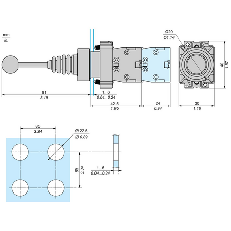 gama de produse: Easy Harmony XB2 Tip produs sau componenta: Controler cu maneta de comanda complet nume scurt al dispozitivului: XD2 diametrul de montaj: 22,5 mm material rama: Metal cromat cantitate indivizibila de vanzare: 1 prezentare dispozitiv: Produs complet [Ui] tensiune nominala de izolatie: 600 V (grad de poluare 3) conformitate cu IEC 60947-1 [Uimp] tensiune de tinere la impuls: 6 kV conformitate cu IEC 60947-1 informatii de pozitie operator: Toate pozitiile informatii directie operator: 4 directii tip si compozitie contacte: 4 NO pentru decuplare lenta utilizare contacte: Contacte standard protectie la scurtcircuit: 10 A gG (gl) gL fuse conformitate cu SR EN 60947-5-1 conexiuni - borne: Borna cu clema cu surub, <= 2 x 1.5 mm² with and without cable ends Borna cu clema cu surub, <= 1 x 2.5 mm² with and without cable ends Borna cu clema cu surub, >= 1 x 0.5 mm² with and without cable ends Borne Faston, dimensiune conexiune6.3 mm forma a capului surubului: Cruce compatibil cu Philips nr. 1 surubelnita Cruce compatibil cu pozidriv No 1 surubelnita Perforat compatibil cu plat O 4 mm surubelnita Perforat compatibil cu plat O 5.5 mm surubelnita durabilitate electrica: 1000000 cic, AC-15, 3 A la 240 V, rata de functionare 1000000 cic, DC-13, 0,27 A la 250 V, rata de functionare securitatea electrica IEC 60947-5-4: Λ < 10exp(-6) la 5 V si 1 mA in mediu curat conformitate cu SR EN 60947-5-4 Λ < 10exp(-8) la 17 V si 5 mA in mediu curat conformitate cu SR EN 60947-5-4 destinatie cod contact: A600-Q600 categorie de supratensiune: Class I conforming to IEC 60536 durabilitate mecanica: 1000000 cic centru de fixare: 85 x 85 mm revenire: fără revenire inaltime: 30 mm latime: 40 mm adancime: 147,5 mm greutate neta: 0,145 kg [Ie] curent nominal de utilizare: 3 A la 240 V, AC-15, A600 conformitate cu SR EN 60947-5-1 0,27 A la 250 V, DC-13, Q600 conformitate cu SR EN 60947-5-1 tip si compozitie contacte: 4 NO Material contacte: Aliaj de argint (Ag/Ni) operare contacte: Decuplare lenta material inel de fixare: Zamak forma a capului unitatii de semnalizare: Rotund descriere borne ISO nr. 1: (13-14)NO (23-24)NO (33-34)NO (43-44)NO mod de fixare: Fixing screw beneath head cuplu recomandat: 0,8 N.m Fixing screw beneath head cuplu recomandat: 1,0 N.m cuplu de strangere: 0,8…1,0 N.m montare dispozitiv: Gaură de fixare - diametru: 22,5 mm [Ith] curent termic conventional in aer liber: 10 A conformitate cu SR EN 60947-5-1 personalizabil: Nu tip de operator: Fără revenire standarde: GB/T 14048.5 SR EN 60947-5-1 SR EN 60947-5-4 GB/T 14048.1 IEC 60947-1 certificari produs: CCC UE tratament protector: TC/TH temperatura ambietala pentru depozitare: -40…70 °C temperatura ambientala de functionare: -25…70 °C rezistenta la vibratii: 5 gn (f= 2…500 Hz) conforming to IEC 60068-2-6 rezistenta la socuri: 30 gn (durata = 18 ms) pentru half sine wave acceleration conformitate cu IEC 60068-2-27 50 gn (durata = 11 ms) pentru half sine wave acceleration conformitate cu IEC 60068-2-27 grad de protectie IP: IP65 grad de protectie IK: IK06