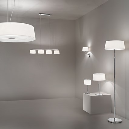 Lampa de podea cu abajurul din folie de PVC imbracat cu material textil de culoare alba. In partea superioara a abajurului prezinta o sticla de culoare alba sablata. Cadru metalic cromat. Lampa este dotata cu 2 becuri (neincluse), cu soclu de tip E14, dar se poate echipa optional cu becuri tip LED, halogen sau economice. Fiind un accesoriu de design de tip modern aduce un plus de refinament incaperilor indeplinindu-si in acelasi timp si rolul functional
