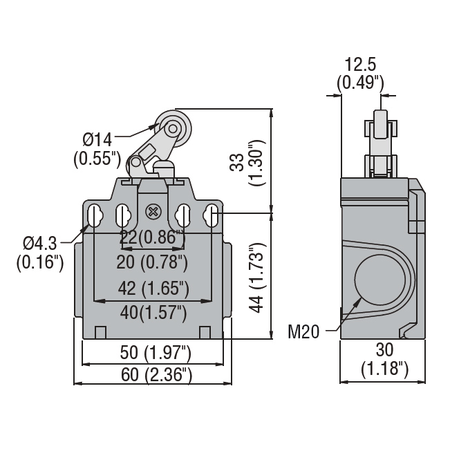 Limitator de cursa, K SERIES, ROLLER CENTRE PUSH LEVER, 2 SIDE CABLE ENTRY. DIMENSIONS COMPATIBLE TO EN 50047, PLASTIC BODY, CONTACTS 1NO+1NC SLOW BREAK. PLASTIC ROLLER Lovato