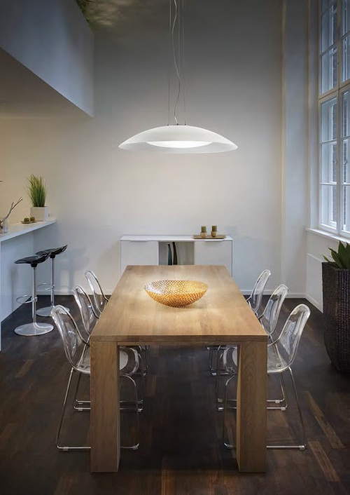 Corp de iluminat suspendat, cu abajurul din sticla dubla: partea superioara este sablata si colorata, iar partea inferioara este sablata si de culoare alba. Cadru metalic cromat. Cablurile electrice cat si firele de sustinere din otel sunt reglabile in inaltime cu ajutorul unui sistem de blocare automat. Lustra este dotata cu 3 becuri (neincluse), cu soclu de tip E27, dar se poate echipa optional cu becuri tip LED, halogen sau economice. Fiind un accesoriu de design de tip modern aduce un plus de refinament incaperilor indeplinindu-si in acelasi timp si rolul functional