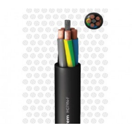 Cablu H07RN-F 3x10mm este un cablu electric flexibil din cupru, cu izolatie si manta din cauciuc de culoare neagra, conceput pentru alimentarea echipamentelor si utilajelor in medii solicitante. Este recomandat pentru utilizare in interior si exterior, inclusiv in aplicatii mobile, datorita rezistentei ridicate la socuri mecanice, abraziune, umezeala si uleiuri.
