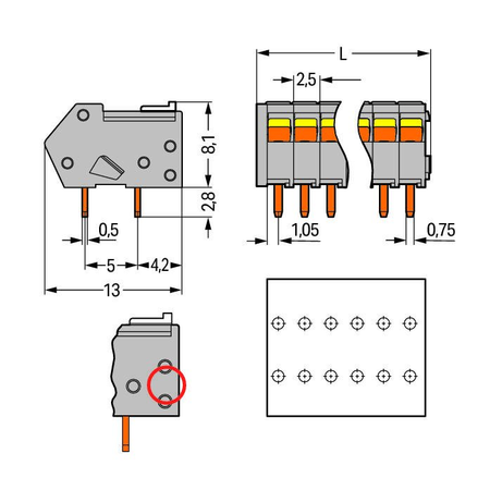 Solder pin dimensions: 0,5 x 0,75 mm;