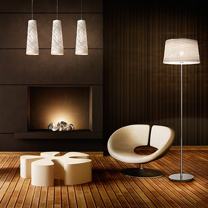 Corp de iluminat suspendat, cu abajurul alcatuit dintr-o tesatura de fire ignifugate . Cadru metalic cromat. Cablurile electrice cat si firele de sustinere din otel sunt reglabile in inaltime cu ajutorul unui sistem de blocare automat. Pendulul este dotat cu 1 bec (neinclus), cu soclu de tip E27, dar se poate echipa optional cu becuri tip LED, halogen sau economice. Fiind un accesoriu de design de tip modern aduce un plus de refinament incaperilor indeplinindu-si in acelasi timp si rolul functional