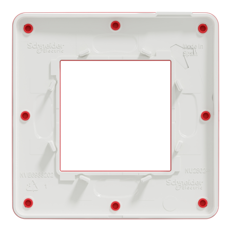 Schneider Electric New Unica cover frame NU280213 is in color red The cover frame is made of polycarbonate, thermoplastic ABS-UV stabilised, making it as resistant as possible. This cover frame has 1 gang Besides, it reaches IK04 protection level, which can help protect against impact. Also, being environment-friendly, this device reached UV resistant, acetone, alcohol, ammonia, bleach, liquid soap, oil, petrol, window-cleaning fluid. This cover frame is SVHC (substances of very high concern) free too. This cover frame belongs to Unica Studio Color aesthetic group. What's more, it well satisfied the standard of IEC 60669-1, IEC 60884-1. It is 85 mm in width. 85 mm in height. 10 mm in depth. Besides it is halogen free halogen free, which is good for your health. With 1 x 2 modules. The fixing mode of this device is clip-in. And the product weighs 0.02 kg. New Unica features innovative functions to carry the range into the smart homes of the future. Welcome to the new Unica a€“ irresistible, beautiful,and innovative.Main