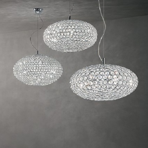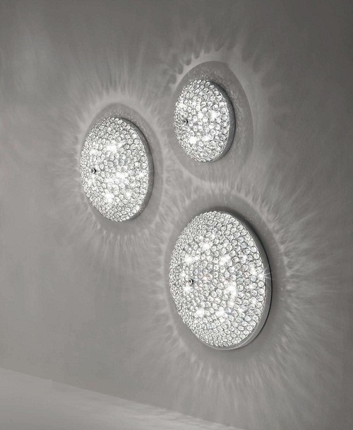 Plafoniera cu abajurul alcatuit din inele metalice decorate cu cristale octogonale incorporate in partea interioara. Cadrul metalic cat si abajurul sunt disponibile in finisaj cromat. Se poate monta pe tavan sau pe perete.