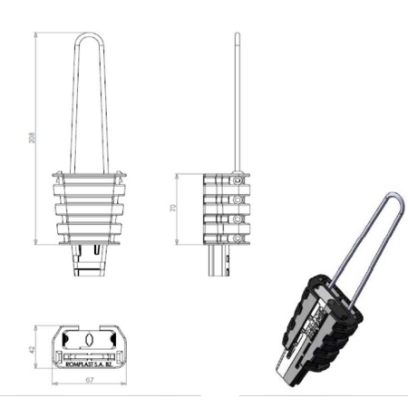 Constructia din polimer rezistent la radiatii UV si la conditii climatice dificile, impreuna cu componentele metalice protejate anticoroziv, asigura functionare stabila pe termen lung. Sistemul intern de pene permite montarea cablului fie prin zona centrala, fie lateral, in functie de tipul cablului utilizat.