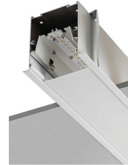 Profil din aluminiu extrudat, vopsit în câmp electrostatic, culoare alb mat, echipat cu setul de cleme pentru instalarea în tavanul fals.