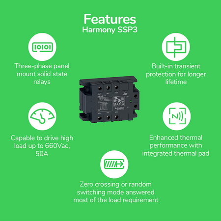 gama de produse: Harmony Solid State Relays Accesorii furnizate: Thermal pad Tip produs sau componenta: Panel mount relay nume scurt al dispozitivului: SSP suport de montare: Panou Number of phases: 3 faze [In] curent nominal: 50 A iesire statica: Comutație aleatorie output switching mode: Comutație aleatorie test button: Without test button [Uc] tensiune circuit de comanda: 4...32 V c.c. tensiunea minima de comutare: 4 V c.c. pornit tensiunea maximă de comutaţie: 1 V c.c. oprit timp de raspuns: 8.33 ms (oprit) 0.1 ms (pornit) Input current: 15…35 mA tensiune de iesire: 42...660 V c.a. curent de sarcina: 0,4…50 A Transient overvoltage: 1200 V curent de suprasarcina: 715 A pentru 20 ms 750 A pentru 16.6 ms I²t maxim pentru ardere fuzibil: 2520 A².s pentru 10 ms la 50 Hz jumătate de ciclu 2320 A².s pentru 8.3 ms la 60 Hz jumătate de ciclu Co-ordination type: TVS curent de fuga maxim: 3 mA starea off cadere de tensiune maxima: dV/dt: 500 V/µs starea off la tensiune maximă Power factor: 0,5 (cu sarcină maximă) Motor controller rating: 1,5 CP la 3 CP la 7,5 CP la 10 CP la putere motor kW: 1,1 kW la 40 °C 120 V AC 2,2 kW la 40 °C 240 V AC 5,5 kW la 40 °C 480 V AC 7,5 kW la 40 °C 600 V AC rezistenta de izolatie: >= 1000 MΩ la 500 V c.c. Maximum capacitance: 8 pF pentru intrare/ieşire rigiditate dielectrică: 4 kV c.a. pentru intrare/ieşire 4 kV c.a. pentru intrare sau ieșire in carcasă [Uimp] tensiune de tinere la impuls: 0,8 kV for input to case 6 kV for input/output circuit 6 kV for input/output to case cuplu de strangere: 1.2 N.m pentru interior 2.5 N.m pentru ieşire conexiuni - borne: Borne cu surub 1 x 0.2 - 1 x 2.5 mm², (AWG 24 - AWG 14) pentru interior Borne cu surub 2 x 1.5...1 x 10 mm², (AWG 16...AWG 9) pentru ieşire Thermal resistance: 0.15 °C/W LED indicator: LED, verde pentru interior grad de protectie IP: IP20 compatibilitate electromagnetica: Descărcare electrostatică 4 kV criteria B descarcare pe contact conformitate cu IEC 61000-4-2 Descărcare electrostatică 9 kV criteria B descarcare in aer conformitate cu IEC 61000-4-2 Perturbații conduse de RF 10 V, 0.15...80 MHz criteriu A conformitate cu IEC 61000-4-6 Test de imunitate la frecventa radio radiata 10 V/m, 80 MHz...1 GHz criteriu A conformitate cu IEC 61000-4-3 Test de imunitate la supratensiuni 1 kV criteria B output ports line to line conformitate cu IEC 61000-4-5 Test de imunitate la supratensiuni 2 kV criteria B output ports line to earth conformitate cu IEC 61000-4-5 Test de imunitate la supratensiuni 1 kV criteria B input ports line to earth conformitate cu IEC 61000-4-5 Tranzienţi rapizi/test de imunitate la impulsuri de ionizare 2 kV, 5kHz criteria B output ports conformitate cu IEC 61000-4-4 Imunitate la goluri de tensiune 0 %/20 ms criteria B conformitate cu IEC 61000-4-11 Imunitate la goluri de tensiune 40 %/200 ms criteria C conformitate cu IEC 61000-4-11 Imunitate la goluri de tensiune 70 %/500 ms criteria C conformitate cu IEC 61000-4-11 Immunity to short interruption 0 %/5 s criteria C conformitate cu IEC 61000-4-11 Tranzienţi rapizi/test de imunitate la impulsuri de ionizare 1 kV, 5kHz criteria B input ports conformitate cu IEC 61000-4-4 Test de imunitate la frecventa radio radiata 3 V/m, 1.4...6 GHz criteriu A conformitate cu IEC 61000-4-3 Emisie radiata 30...1000 Mhz environment A conformitate cu IEC 60947-1 Emisie efectuata 0.15...30 Mhz environment A conformitate cu IEC 60947-1 greutate neta: 0,37 kg latime: 104 mm inaltime: 74,6 mm adancime: 41 mm prezentare dispozitiv: Produs complet Intarziere flacara: V0 conformitate cu UL 94 temperatura ambientala de functionare: -40…80 °C temperatura ambietala pentru depozitare: -40…125 °C Grad de poluare: 2 categorie de supratensiune: III certificari produs: UE CSA EAC UL UKCA marcaj: CE standarde: IEC/EN 62314 IEC/EN 60947-4-2 IEC/EN 60947-4-3 UL 60947-4-2 C22.2 No. 14