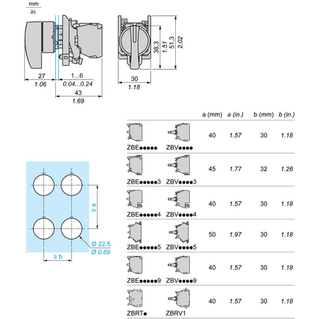 gama de produse: Harmony XB4 Tip produs sau componenta: Selector nume scurt al dispozitivului: XB4 material rama: Metal cromat material inel de fixare: Zamak diametrul de montaj: 22,5 mm cantitate indivizibila de vanzare: 1 tip cap: Standard forma a capului unitatii de semnalizare: Rotund tip de operator: fără revenire profil utilizator: Negru manetă lungă informatii de pozitie operator: 2 pozitii 90° tip si compozitie contacte: 1 NO operare contacte: Decuplare lenta conexiuni - borne: Borne cu surub, <= 2 x 1.5 mm² cu pini conformitate cu IEC 60947-1 Borne cu surub, >= 1 x 0.22 mm² fara terminale de cablu conformitate cu IEC 60947-1 inaltime: 48 mm latime: 30 mm adancime: 68 mm descriere borne ISO nr. 1: (13-14)NO greutate neta: 0,096 kg rezistenta la spalare cu presiune inalta: 7000000 Pa la 55 °C, distanta : 0.1 m utilizare contacte: Contacte standard deschidere pozitiva: Fara valoare cuplu: 0,14 N.m modificarea stării electrice NO durabilitate mecanica: 1000000 cic cuplu de strangere: 0,8…1,2 N.m conformitate cu IEC 60947-1 forma a capului surubului: Cruce compatibil cu Philips nr. 1 surubelnita Cruce compatibil cu pozidriv No 1 surubelnita Perforat compatibil cu plat O 4 mm surubelnita Perforat compatibil cu plat O 5.5 mm surubelnita Material contacte: Aliaj de argint (Ag/Ni) protectie la scurtcircuit: 10 A cartuş fuzibil tip gG conformitate cu SR EN 60947-5-1 [Ith] curent termic conventional in aer liber: 10 A conformitate cu SR EN 60947-5-1 [Ui] tensiune nominala de izolatie: 600 V (grad de poluare 3) conformitate cu IEC 60947-1 [Uimp] tensiune de tinere la impuls: 6 kV conformitate cu IEC 60947-1 [Ie] curent nominal de utilizare: 3 A la 240 V, AC-15, A600 conformitate cu SR EN 60947-5-1 6 A la 120 V, AC-15, A600 conformitate cu SR EN 60947-5-1 0,1 A la 600 V, DC-13, Q600 conformitate cu SR EN 60947-5-1 0,27 A la 250 V, DC-13, Q600 conformitate cu SR EN 60947-5-1 0,55 A la 125 V, DC-13, Q600 conformitate cu SR EN 60947-5-1 1,2 A la 600 V, AC-15, A600 conformitate cu SR EN 60947-5-1 durabilitate electrica: 1000000 cic, AC-15, 2 A la 230 V, rata de functionare 1000000 cic, AC-15, 3 A la 120 V, rata de functionare 1000000 cic, AC-15, 4 A la 24 V, rata de functionare 1000000 cic, DC-13, 0,2 A la 110 V, rata de functionare 1000000 cic, DC-13, 0,5 A la 24 V, rata de functionare securitatea electrica IEC 60947-5-4: Λ < 10exp(-6) la 5 V si 1 mA in mediu curat conformitate cu SR EN 60947-5-4 Λ < 10exp(-8) la 17 V si 5 mA in mediu curat conformitate cu SR EN 60947-5-4 prezentare dispozitiv: Produs complet tratament protector: TH temperatura ambietala pentru depozitare: -40…70 °C temperatura ambientala de functionare: -40…70 °C categorie de supratensiune: Class I conforming to IEC 60536 grad de protectie IP: IP69 IP69K IP67 conformitate cu SR EN 60529 grad de protectie NEMA: NEMA 13 NEMA 4X standarde: IEC 60947-5-5 CSA C22.2 No 15 UL 60947-1 SR EN 60947-5-4 SR EN 60947-5-1 IEC 60947-1 JIS C8201-5-1 JIS C8201-1 certificari produs: BV UL CSA DNV LROS (Lloyds register of shipping) rezistenta la vibratii: 5 gn (f= 2…500 Hz) conforming to IEC 60068-2-6 rezistenta la socuri: 30 gn (durata = 18 ms) pentru half sine wave acceleration conformitate cu IEC 60068-2-27 50 gn (durata = 11 ms) pentru half sine wave acceleration conformitate cu IEC 60068-2-27