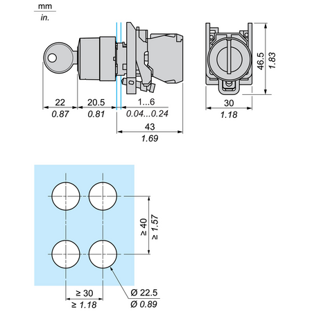 montare dispozitiv: Gaură de fixare - diametru: 22,5 mm 22.3 +0.4/0 conformitate cu IEC 60947-1