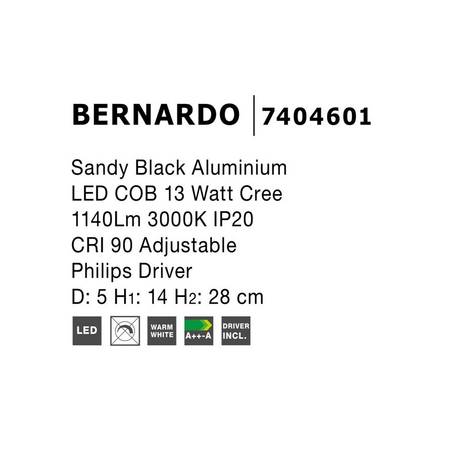 Spot BERNARDO Sandy Black Aluminiu LED Ajustabil 13 Watt Philips COB Driver 1140Lm 3000K IP20 Dimensiuni: 5 H1: 14 H2: 28 cm