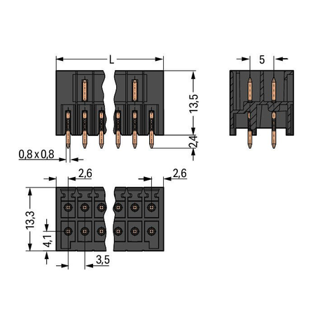 THR male header, 2-row; 0.8 x 0.8 mm solder pin; straight; 100% protected against mismating; in tape-and-reel packaging; Pin spacing 3.5 mm; 2 x 3-pole; black Wago