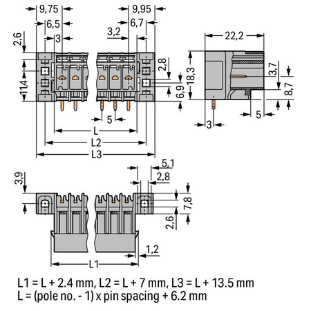 THT male header; 1.0 x 1.0 mm solder pin; angled; clamping collar; Pin spacing 5 mm; 3-pole; gray Wago