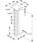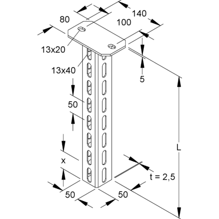 Umeras, profil U, 50x50x505 mm, otel, zincat la cald DIN EN ISO 1461 Umeras, profil U perforat continuu pe trei laturi, cu placa de cap sudata, sistem HU 5050/..., pentru suporturi pentru montaj cu una, doua si trei laturi, pentru a preveni deformarea suportului deasupra capului profilului, la distanta suportului de montare a profilului deasupra capului. HDS 50. 50 F cu surub hexagonal trebuie luat in considerare. Daca suportul este fixat pe profilul suportului de sus pe o singura parte, partea inchisa a suportului ar trebui, de preferinta, sa fie montata la acelasi nivel cu bara de profil a suportului de sus. Din motive statice si pentru a permite montarea fara probleme a capacului de protectie, suportul trebuie montat la o distanta de x=50 mm (marginea inferioara a suportului pana la capatul suportului de sus), deasupra capatului suportului de sus. Va rugam sa respectati reglementarile suplimentare pentru utilizarea in intretinerea functionala sau pentru tavanele suspendate cu cerinte de protectie impotriva incendiilor (MLAR 2/2015 exemplu de ghidare a sistemului de cabluri)! Certificat VDE! pentru suport: KTAL... KTAM... KTA... pentru suport : KTAS 100 - 400 (intretinere functionala/KFO) pentru suport : KTA 100 - 600 (intretinere functionala/MLAR) Dimensiuni (aprox. Dimensiuni) Placa de cap L x l x a : 140 x 80 x 5 mm Orificii de fixare: 13 x 20 mm distanta centrala: 100 mm Profil U : 50 x 50 x 50 mm Grosimea materialului t : 2,5 mm gauri de profil cu trei laturi, un singur rand: 12 x 30 mm distanta centrala: 50 mm Lungime totala L : 505 mm Material: Otel, galvanizat la cald conform. DIN EN ISO 1461