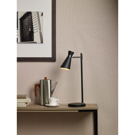 The ASHWORTH in soft matt black and sleek polished chrome detail. This distinctive bonnet shaded table lamp has sharp lines and oozes sophistication. With a smart black braided cable and in line rocker switch and an adjustable head that can be angled, this compact table lamp will illuminate specific spaces or create great mood lighting.Measurements D17 x H53 x W27cm