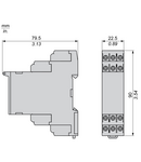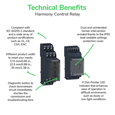 gama de produse: Harmony Control Relays tip releu: Releu de control al tensiunii Tip produs sau componenta: Voltage control relay numar faze in retea: 1 fază tip circuit de alimentare: C.c. nume releu: RM22UA parametri monitorizati ai releului: Subtensiune sau supratensiunein modul fereastra Detectare supratensiune sau subtensiune time delay: Adjustable 0.1...30 s, +/- 10 % din valoarea la capatul scarii Tt- time delay upon fault capacitatea de comutare in VA: 2000 VA interval de masura: 1...100 V c.a./c.c. tip si compozitie contacte: 2 C/O resetare timp: 1500 ms la tensiune maximă tensiunea maxima de comutatie: 250 V c.a. curentul minim de comutare: 10 mA la 5 V c.c. curent maxim de comutatie: 8 A c.a. limitele tensiunii de alimentare: 20,4…264 V c.a./c.c. puterea consumata in VA: 3,5 VA c.a. consum de putere maxim in W: 1,5 W c.c. imunitate la microintreruperi: 10 ms rezistenta la borne: 110 kOhm la terminalele E2-M 22 kOhm la terminalele E1-M 220 kOhm la terminalele E3-M contacte de iesire: 2 C/O curent nominal de iesire: 8 A histerezis: 3 % fix din full scale for window mode 5…50 % reglabil din setare prag delay at power up: 600 ms cilclul maxim de masura: 100 ms ciclu de măsurare ca valoare true rms precizie de repetare: +/- 0,5 % pentru circuit de intrare şi măsură +/- 2 % pentru temporizare eroare de masurare: < 1 % din intreaga gamă cu variaţie de tensiune 0,05 %/°C cu variaţia temperaturii timp de raspuns: <= 500 ms rezistenta de izolatie: > 100 MOhm la 500 V c.c. categorie de supratensiune: III conforming to SR EN 60664-1 izolatie: Intre alimentare si masurare conexiuni - borne: Borne cu surub, 3 x 0.5 - 2 x 2.5 mm² (AWG 20...AWG 14) solid fara terminale de cablu Borne cu surub, 2 x 0.2 - 2 x 1.5 mm² (AWG 24 - AWG 16) flexibil cu pini Borne cu surub, 2 x 0.5 - 1 x 3.3 mm² (AWG 20 - AWG 12) solid fara terminale de cablu Borne cu surub, 1 x 0.2 - 1 x 2.5 mm² (AWG 24 - AWG 14) flexibil cu pini cuplu de strangere: 0,6…1 N.m conformitate cu IEC 60947-1 material carcasa: Plastic cu autostingere suport de montare: Sina DIN 35 mm conformitate cu IEC 60715 Durabilitate electrica: 100000 cic durabilitate mecanica: 10000000 cic categorie de utilizare: AC-15 conformitate cu SR EN 60947-5-1 DC-13 conformitate cu SR EN 60947-5-1 AC-1 conformitate cu IEC 60947-4-1 DC-1 conformitate cu IEC 60947-4-1 [Un] rated nominal voltage: 24...240 V c.a./c.c. 50/60 Hz non self-powered fiabilitate securitate date: B10d = 290000 MTTFd = 308.2 ani Material contacte: Fara cadmiu tip de control: With test button latime: 22,5 mm greutate neta: 0,11 kg compatibilitate electromagnetica: Immunity for residential, commercial and light-industrial environments conforming to IEC 61000-6-1 Imunitate pentru medii industriale conforming to IEC 61000-6-2 Emisii standard pentru mediul rezidenţial, comercial şi uşor industrial conforming to IEC 61000-6-3 Emisii standard pentru mediul industrial conforming to IEC 61000-6-4 Descărcare electrostatică - test level: 6 kV nivel 3 (descarcare pe contact) conforming to IEC 61000-4-2 Descărcare electrostatică - test level: 9 kV nivel 3 (descarcare in aer) conforming to IEC 61000-4-2 Test de imunitate la frecventa radio radiata - test level: 10 V/m nivel 3 conforming to IEC 61000-4-3 Tranzienţi rapizi/test de imunitate la impulsuri de ionizare - test level: 4 kV nivel 4 (direct) conforming to IEC 61000-4-4 Tranzienţi rapizi/test de imunitate la impulsuri de ionizare - test level: 2 kV nivel 4 (capacitive coupling) conforming to IEC 61000-4-4 Test de imunitate la supratensiuni - test level: 4 kV nivel 4 (mod comun) conforming to IEC 61000-4-5 Test de imunitate la supratensiuni - test level: 2 kV nivel 4 (mod diferential) conforming to IEC 61000-4-5 Emisii conduse şi radiate clasa B grupa 1 conforming to CISPR 11 Emisii conduse şi radiate clasa B conforming to CISPR 22 temperatura ambientala de utilizare: -20…50 °C la 60 Hz -20…60 °C la 50 Hz standarde: IEC 60255-1 certificari produs: GL UL CCC EAC UE RCM CSA temperatura ambietala pentru depozitare: -40…70 °C umiditate relativa: 93…97 % la 25…55 °C conformitate cu IEC 60068-2-30 rezistenta la vibratii: 0.075 mm (f= 10…58,1 Hz) nu in funcționare conformitate cu IEC 60068-2-6 1 gn (f= 10…58,1 Hz) nu in funcționare conformitate cu IEC 60068-2-6 0.035 mm (f= 58,1…150 Hz) in functionare conformitate cu IEC 60068-2-6 0.5 gn (f= 58,1…150 Hz) in functionare conformitate cu IEC 60068-2-6 rezistenta la socuri: 15 gn (durata = 11 ms) pentru nu in funcționare conformitate cu IEC 60068-2-27 5 gn (durata = 11 ms) pentru in functionare conformitate cu IEC 60068-2-27 grad de protectie IP: IP20 conformitate cu SR EN 60529 (borne) IP40 conformitate cu SR EN 60529 (carcasă) IP50 conformitate cu SR EN 60529 (panou frontal) grad de poluare: 3 conformitate cu SR EN 60664-1 tensiune de incercare: 2,5 kV c.a. 50 Hz, 1 min. conformitate cu IEC 60255-27
